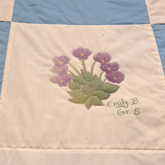 "N.B. celebrated 200 years of being a province in 1984. We grade 5 teachers Mabel Danson, Margaret Corbett, and myself, Carol Branscombe, decided to make a quilt to honour the occasion. Any student in our school who wanted to make an artex paint block were welcomed to do so. The block had to depict something from our past. We invited quilters to come quilt if they wished. My mother and whoever she could talk into coming were regular quilters. Our dear Mabel set the quilt blockers together and bound the quilt. Here at 40 years later is that quilt. Enjoy!"